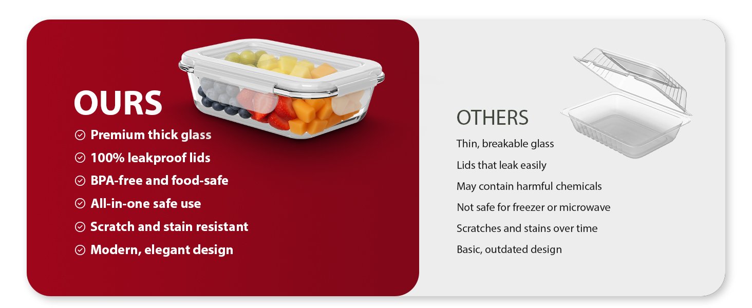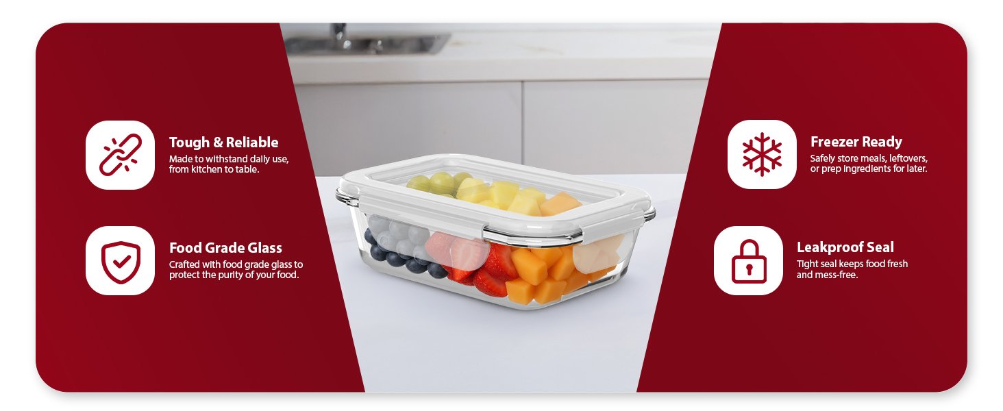 • LEAKPROOF AIRTIGHT LIDS FOR MAXIMUM FRESHNESS – Each container features a secure snap-lock lid and silicone seal to keep contents fresh and prevent leaks or spills. These glass storage containers with lids are perfect for both home use and on-the-go lifestyles.